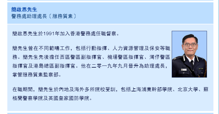 香港國安法實施後,警方已拘捕超過20名涉嫌違反國安法的人,令不少反中亂港分子陣腳大亂。警務處處長鄧炳強及擔任警務處國家安全處負責人的副處長(國家安全)劉賜蕙均為香港國安委成員,而國安處處長一職由蔡展鵬擔任。點新聞記者今日(4日)從政府新聞處網站的電話簿看到,國安處新增一名助理處長,由原任助理處長(服務質素)的簡啟恩調任,與江學禮並列。