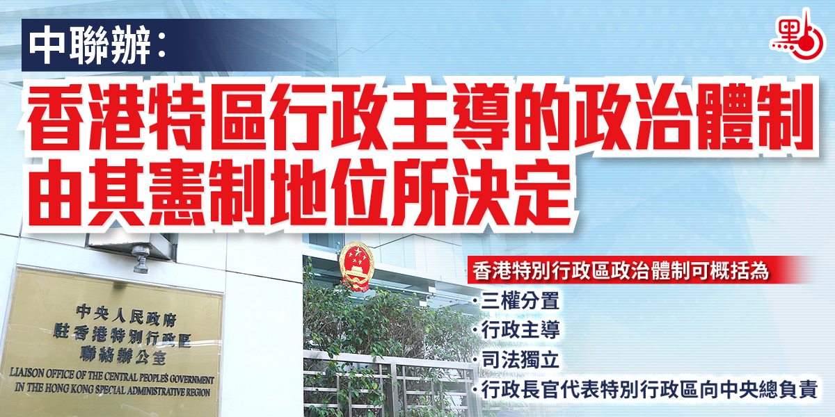 中央人民政府駐香港特別行政區聯絡辦公室發言人今日(7日)表示,近日有關香港特別行政區政治體制話題引起社會關注討論,林鄭月娥行政長官發表談話指出,香港特別行政區的政治體制是「行政主導」,而非「三權分立」。對此,香港中聯辦表示贊同和支持,對於這個原則性問題,有必要明確予以澄清。