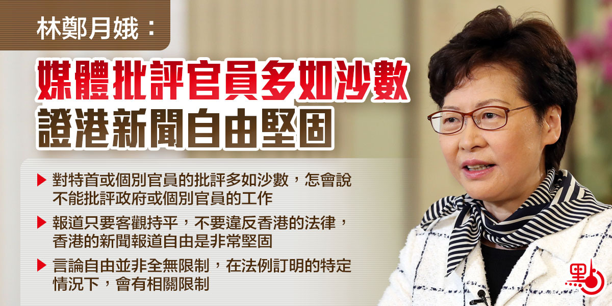 林鄭月娥說每日只要打開報紙、電子傳媒或在網上,對於政府、特首或個別官員的批評多如沙數,怎會說不能批評政府或個別官員的工作。她說,傳媒的報道只要客觀持平,不要違反香港的法律,香港的新聞報道自由是非常堅固。