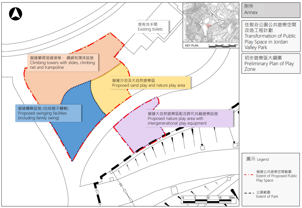 政府在去年《施政報告》提到,計畫在未來5年改造全港超過170個康文署轄下的公共遊樂空間。其中佐敦谷公園將以「親子」及「大自然」為設計概念,初步畫分為4個遊樂區,當中攀爬區設有繩網及攀爬架等,另有鞦韆區設置親子共用的鞦韆等,從而加強親子家庭關係。改造工程預計明年第二季開展,料2022年底完成。