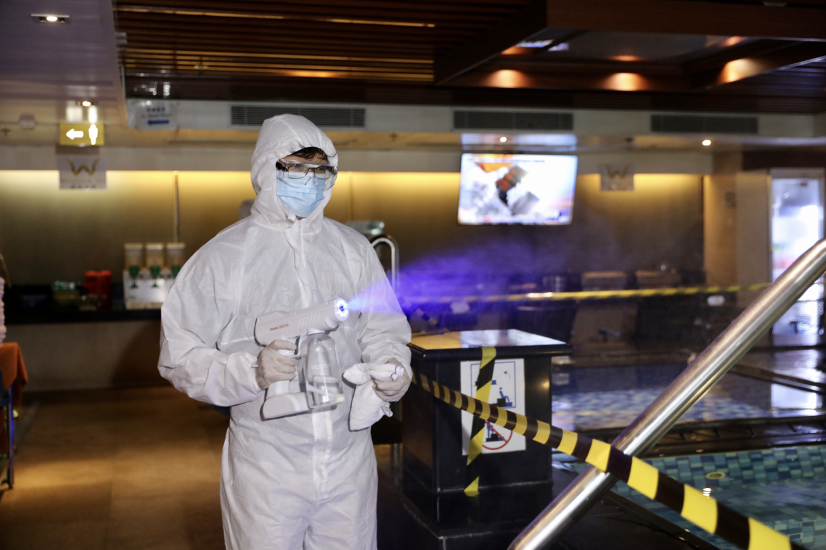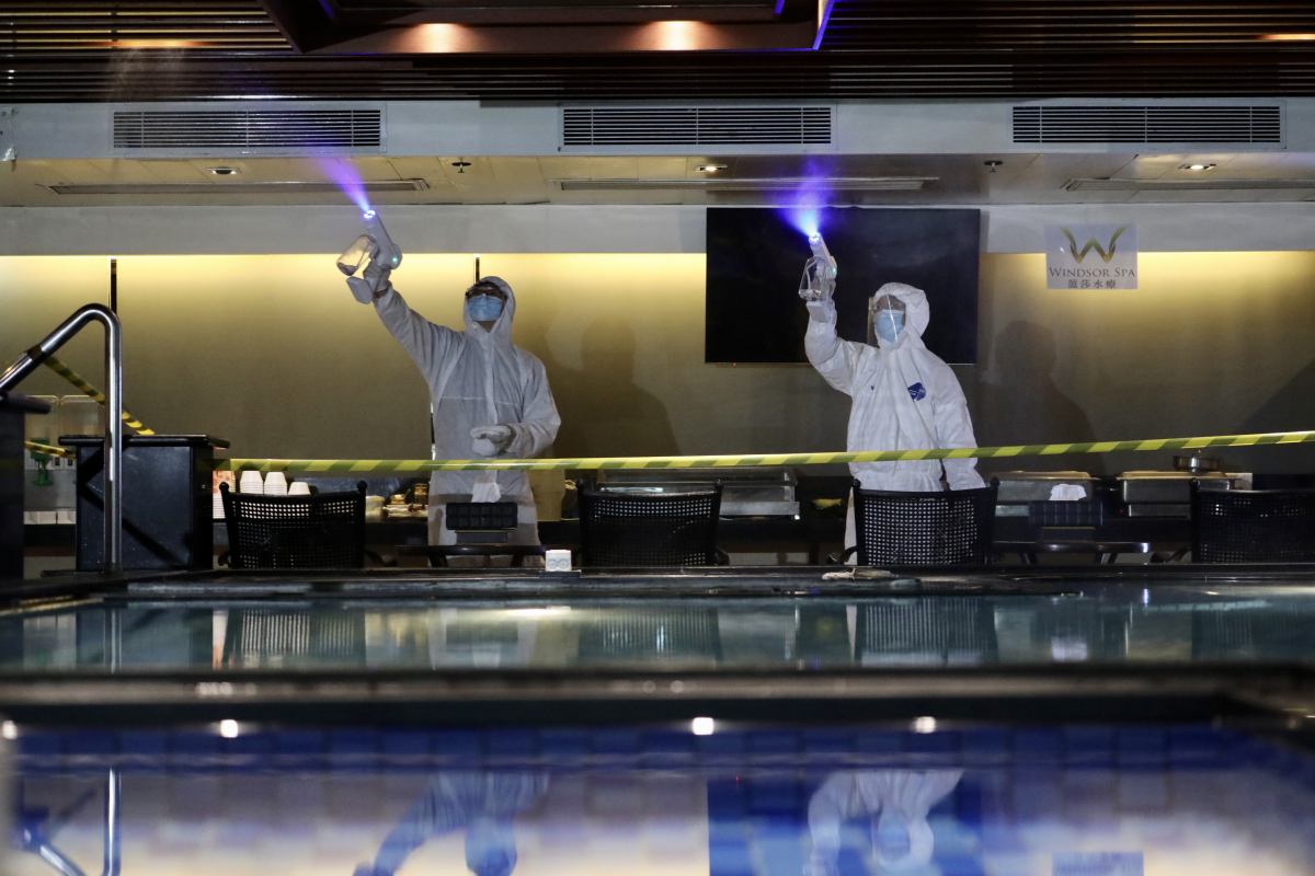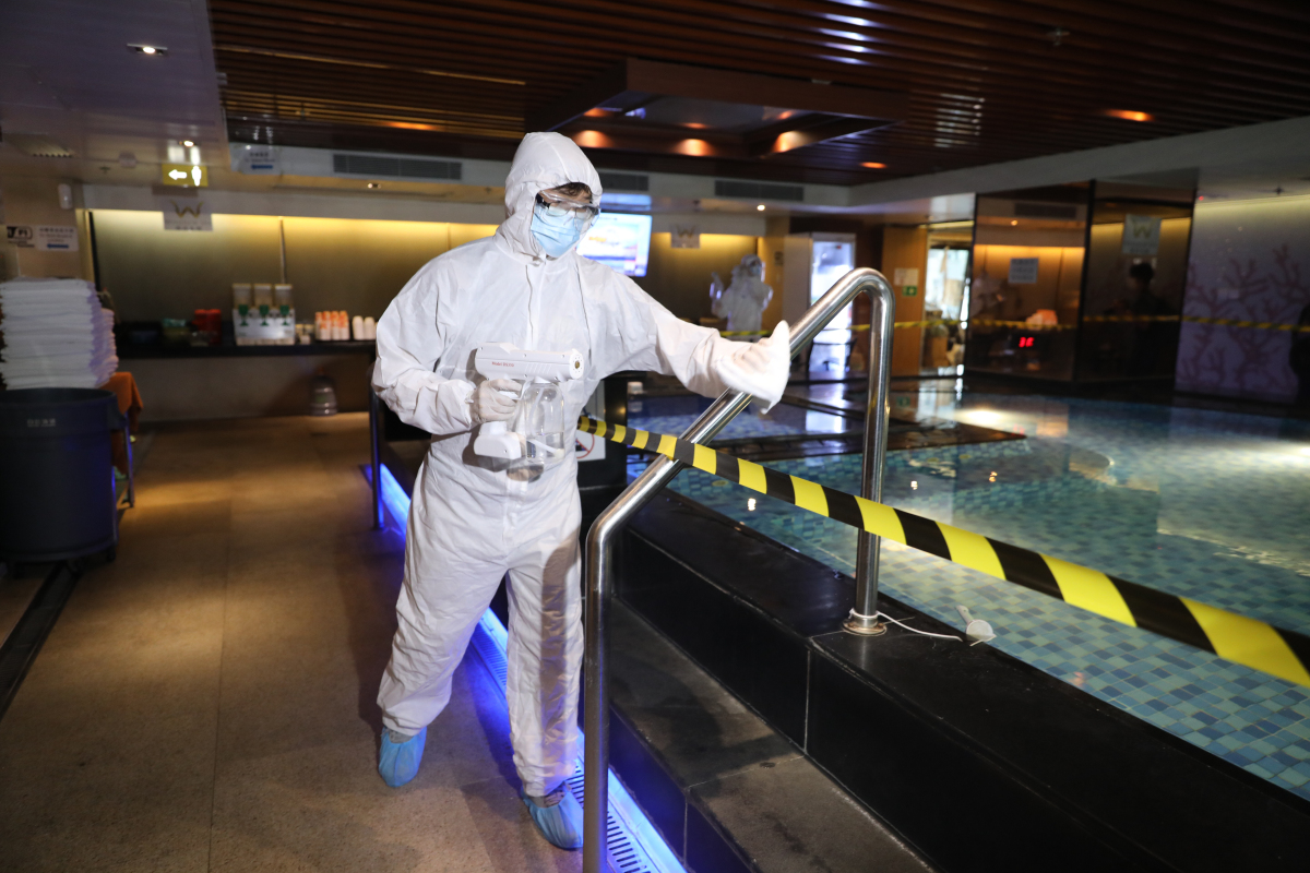 港府放寬防疫措施,洗浴中心等將於明日(18日)獲有條件復業。有洗浴中心員工今日對洗浴設施進行紫外線霧化消毒,及展示所採取防疫衞生措施,準備明日開放。 (點新聞記者李斯哲攝)