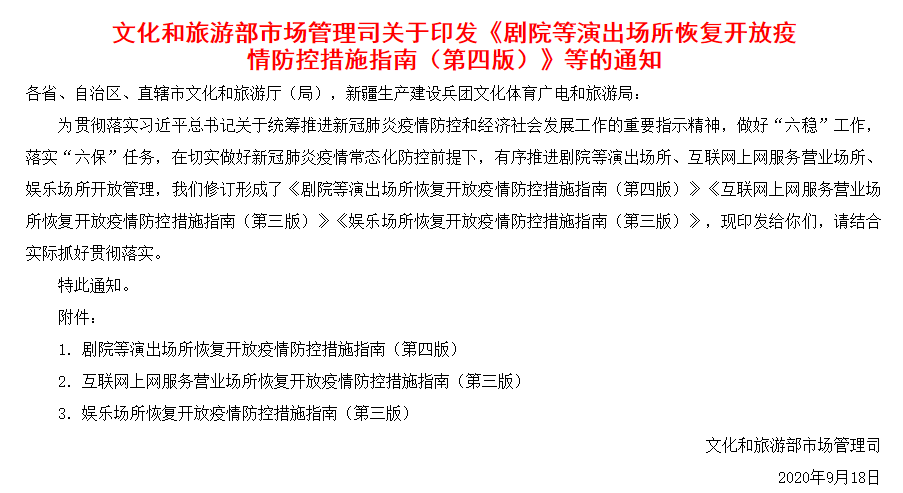 文化和旅遊部市場管理司18日晚間發布《劇院等演出場所恢復開放疫情防控措施指南(第四版)》,指出要堅持常態化精準防控和局部應急處置有機結合,重點加強對上述場所的精準防控,原則上不對全轄區、全行業實行「一刀切」。