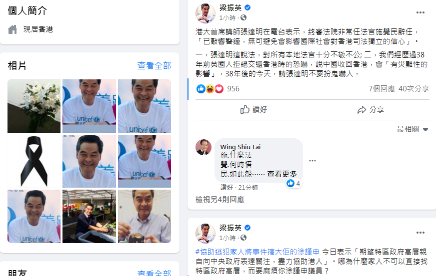 梁振英在貼文中表示了一下兩點看法:一,張達明這說法,對所有本地法官十分不敬不公; 二,我們經歷過38年前英國人拒絕交還香港時的恐嚇,說中國收回香港,會「有災難性的影響」,38年後的今天,請張達明不要扮鬼嚇人。