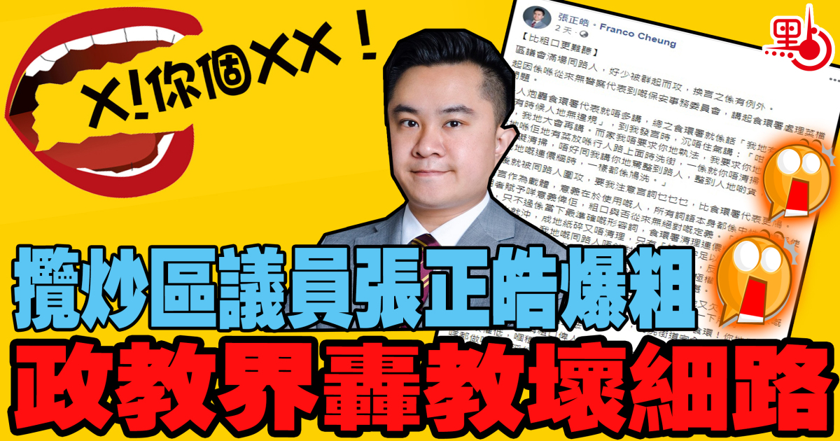 攬炒派北區區議員、曾任補習老師的張正皓早前因多次在會議上講粗言穢語,遭到多名同屬攬炒派的議員圍攻,要求張正皓注意言辭。不過,張正皓日前於Fb發帖稱,「所有詞語本身都喺中性」、「粗口與否從來無絕對嘅定義」和「粗口只不過喺當下最準確嘅形容詞」,反斥同路人「語言潔癖」,並反問自己爆粗指罵政府有何問題。