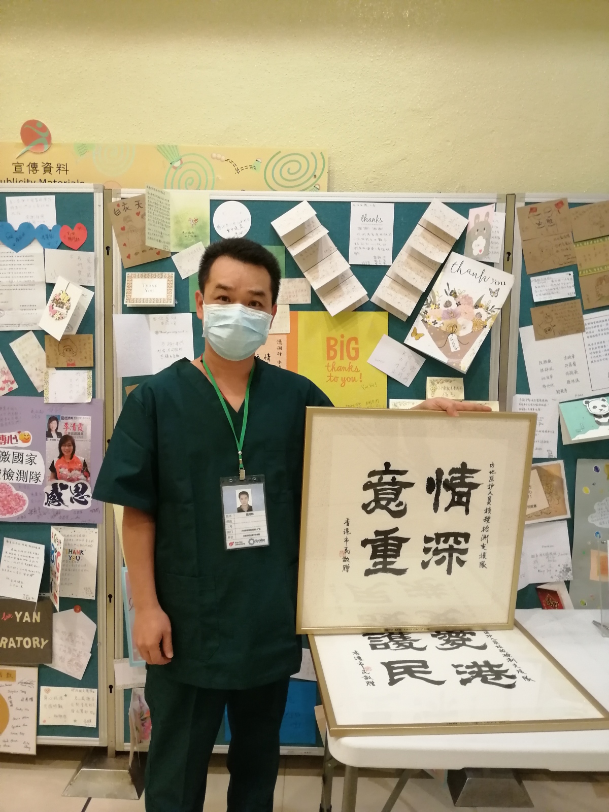 姚葉林(東莞市鬆山湖中心醫院):其實,在香港我也有親朋好友丶同學等,他們也知道我來港,要與我見面相聚,但我要遵守支援隊的「五項制度」,都婉拒了他們的好意!還有很多熱心香港同胞送來鮮花丶賀卡丶字畫等等,我們感到非常溫暖,更加有動力了。還有酒店的工作人員,為我們的衣丶食丶住丶行提供了有力保障,非常感謝。在離店時,我在房間留下了一份感謝留言。