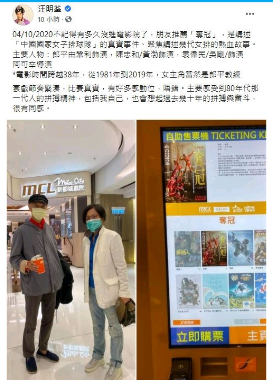阿姐今日凌晨在facebook留言:「不記得有多久沒進電影院了,朋友推薦《奪冠》,是講述中國國家女子排球隊的真實事件,聚焦講述幾代女排的熱血故事。主要人物:郎平由鞏俐飾演,陳忠和/黃渤飾演,袁偉民/吳剛飾演,陳可辛導演。電影時間跨越38年,從1981年到2019年,女主角當然是郎平教練。套戲節奏緊湊,比賽真實,有好多感動位,唔錯。主要感受到80年代那一代人的拼搏精神,包括我自己,也會想起過去幾十年的拼搏與奮鬥,很有同感。」