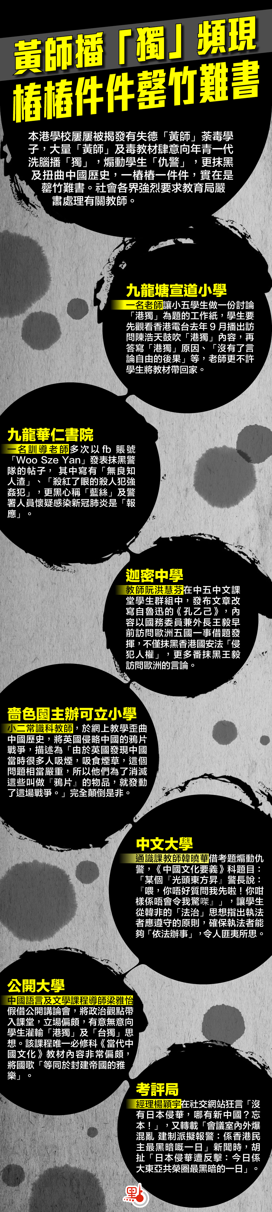 本港學校屢屢被揭發有失德「黃師」荼毒學子,大量「黃師」及毒教材肆意向年青一代洗腦播「獨」,煽動學生「仇警」,更抹黑及扭曲中國歷史,一樁樁一件件,實在是罄竹難書。社會各界強烈要求教育局嚴肅處理有關失德教師。