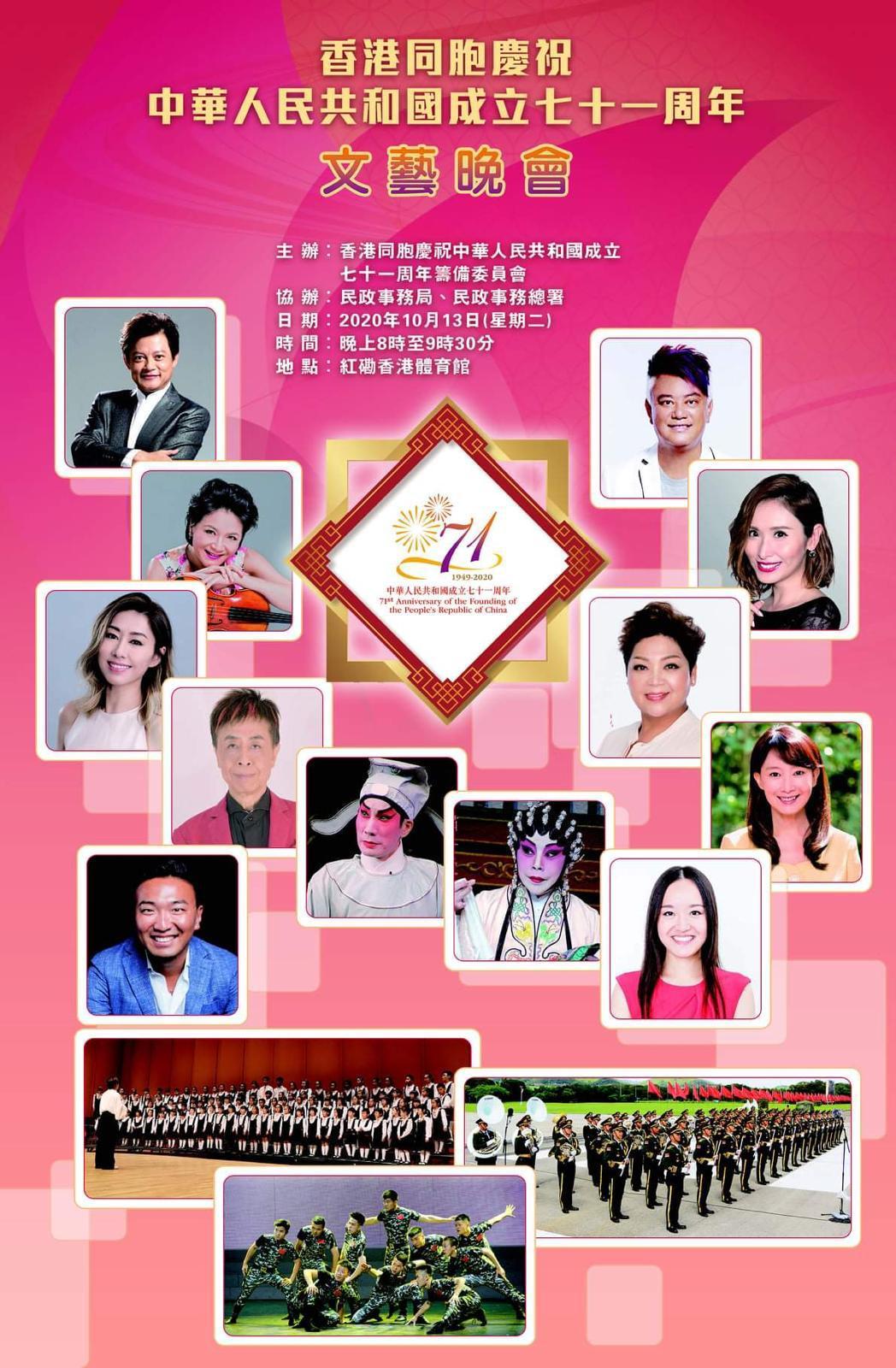 由香港同胞慶祝國慶籌委會主辦、以「自强不息」為主題《香港同胞慶祝中華人民共和國成立七十一周年文藝晚會》,於今日(13日)晚在紅磡體育館舉行。晚會由有線綜合娛樂台將於今日(13日)晚上8時正直播,並於晚上在免費電視77台香港開電視播出。