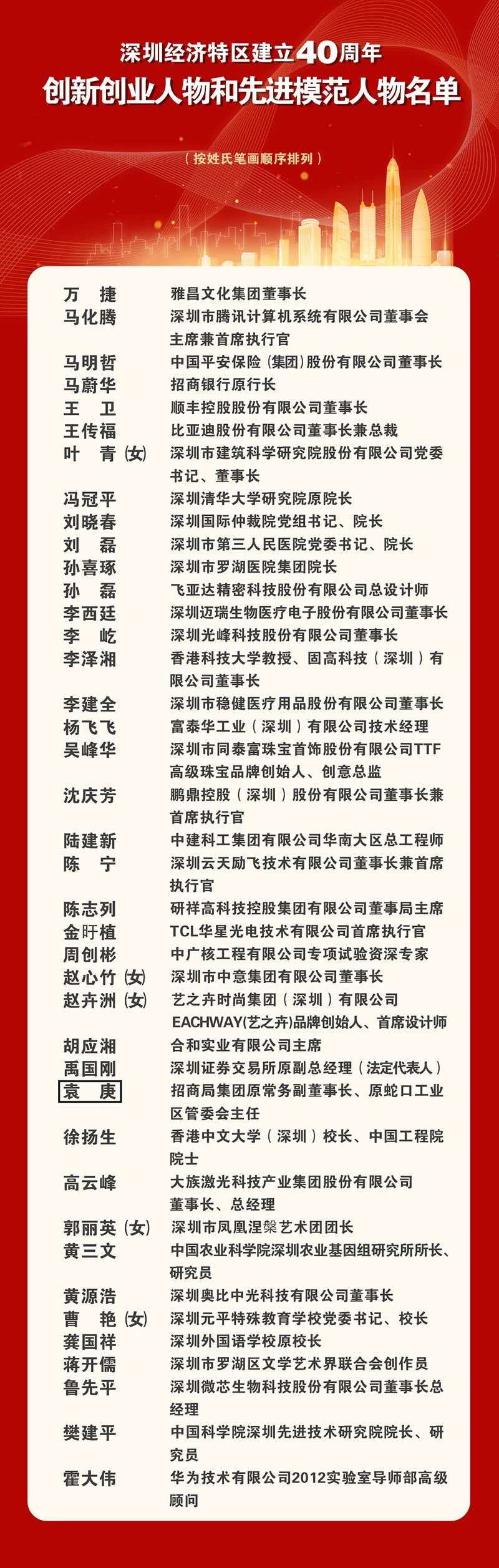 在深圳經濟特區建立40周年之際,為表彰先進、鼓舞鬥志,進一步激發全市人民幹事創業熱情,全面推進粵港澳大灣區和中國特色社會主義先行示範區建設,10月11日,中共深圳市委、深圳市人民政府發布關於表彰深圳經濟特區建立40周年創新創業人物和先進模範人物的決定,對萬捷等40名深圳經濟特區建立40周年創新創業人物和先進模範人物進行表彰。當中,香港合和實業有限公司主席胡應湘,香港科技大學教授、固高科技(深圳)有限公司董事長李澤湘,香港中文大學(深圳)校長、中國工程院院士徐揚生等多位港人榜上有名。