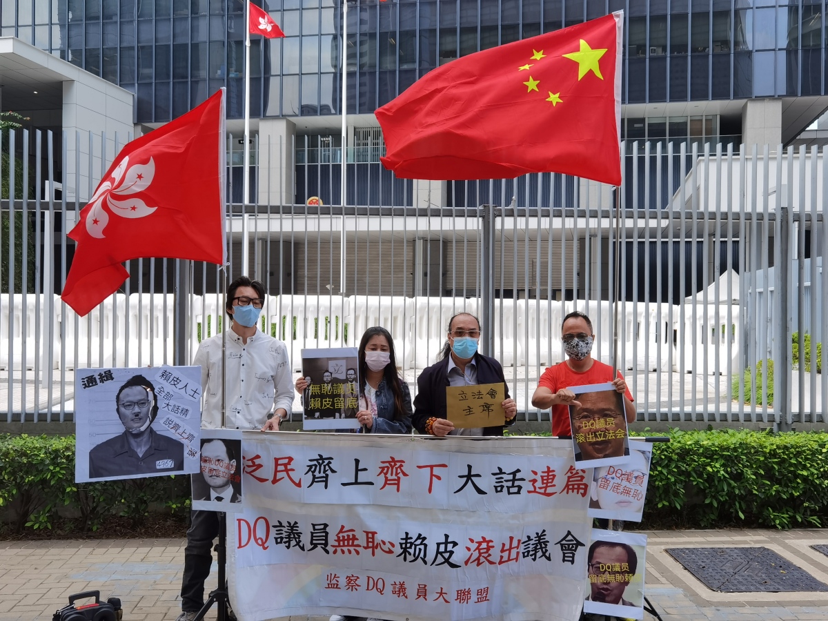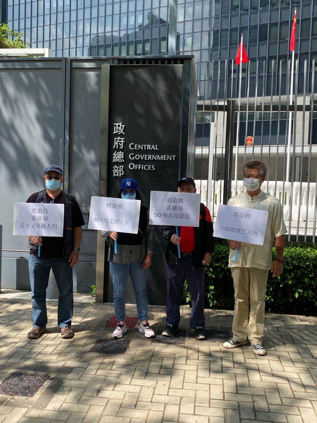 另外,愛國愛港市民組織「反攬炒關注組」同樣因不滿4名被DQ議員在立法會中厚顏無恥繼續參會,企圖攬炒香港、搞亂社會,今早亦手持「郭家麒,真離奇,DQ唔走沒面皮」、「楊岳橋,賴死唔走被人笑」、「郭榮鏗,只搞破壞乞人憎」、「梁繼昌,養雞場,又差又臭被人唱」標語,到政府總部外抗議。