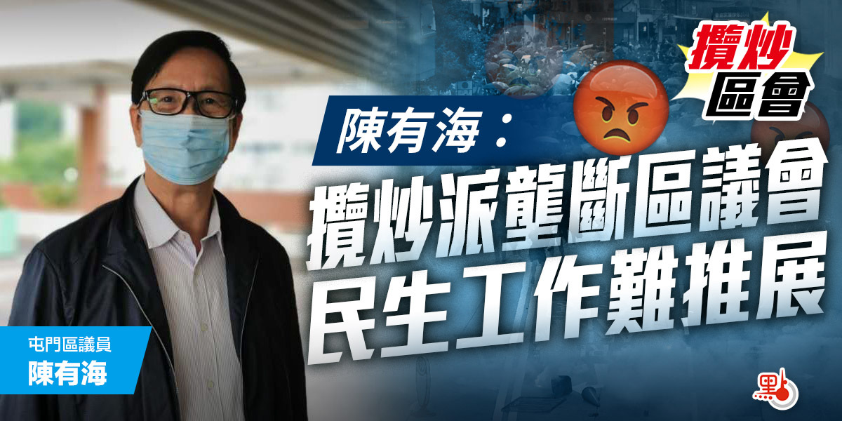 去年黑暴之後,陳有海成為屯門區議會僅剩4位建制區議員之一。陳有海慨嘆區議會本身是提供一個良好平台為市民做事,只可惜今屆議會很多建制議員都失去議席,反對派壟斷區議會後,只集中精神炒作政治議題,令民生工作都無法落實,「以今年事件為例,疫症爆發,全港區議會都爭相購買口罩及防護物資協助市民抗疫,本身是一件利民好事,可是反對派在議會內堅持購買『豬咀』口罩,不單價錢昂貴,不實用更令人聯想起黑暴事件,結果令添購工作一再延後,這些都是反對派將民生議題政治化的禍害。」
