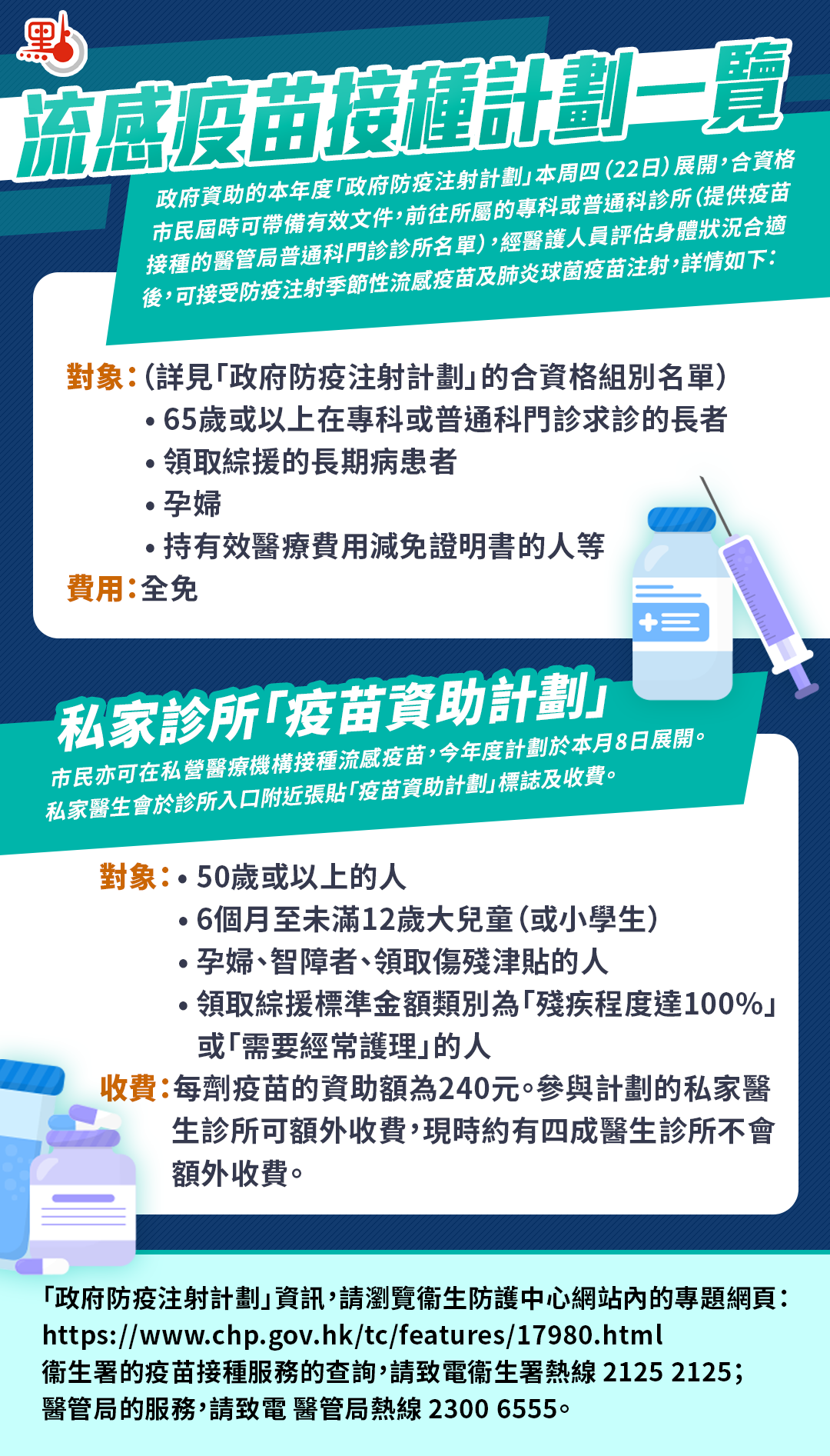 政府資助的本年度「政府防疫注射計劃」本周四(22日)展開,合資格市民屆時可帶備有效文件,前往所屬的專科或普通科診所,經醫護人員評估身體狀況合適後,可接受防疫注射季節性流感疫苗及肺炎球菌疫苗注射,亦可前往接受政府資助的私家診所。點新聞網為你整理一份注射流感疫苗指南,一圖了解有關詳情。