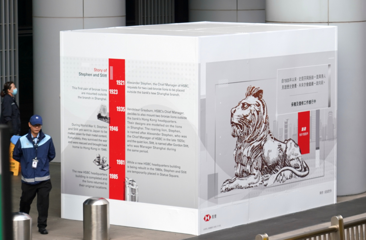 滙豐銀行外兩隻銅獅經首階段復修後,將於今日(22日)拆封圍板。滙豐香港區行政總裁施穎茵去信滙豐員工,指總行門口兩隻銅獅,「史提芬」和「施迪」,今日在一項簡單而隆重的儀式後就會重新亮相。施穎茵指,因應疫情的社交距離限制,拆封儀式一切從簡,公司稍後會將相關影片和相片,上載到公司網站和社交平台。