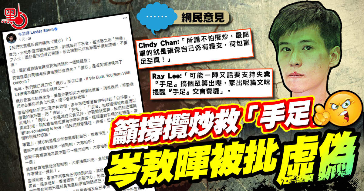 不過,黃絲網民就似乎唔多支持,批評岑敖暉虛偽,自己「糧支」袋袋平安,但就叫其他「手足」承受「攬炒」帶來的代價。有人更揶揄:「咁你肯將眾籌既(嘅)錢派出嚟救手足嗎?」、「可能一陣又話要支持失業『手足』搞個眾籌出嚟,而家出呢篇文咪提醒『手足』交會費囉」。