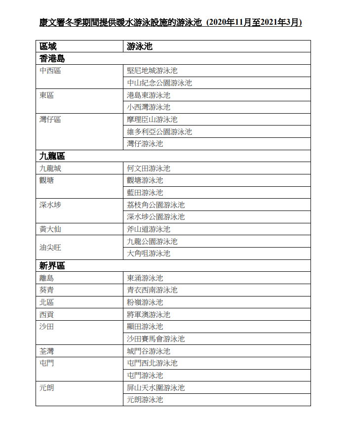 康樂及文化事務署今日(30日)宣布,冬季期間即今年11月至明年3月,在各區開放轄下共26個提供暖水游泳設施的游泳池,方便市民在冬季繼續勤做運動。署方呼籲市民在享受游泳樂趣之餘,要注意安全,顧己及人,保持公眾泳池清潔衞生。