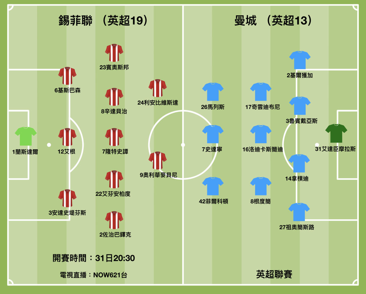曼城上仗憑費倫托利斯、根度簡及史達寧的入波,作客以3︰0橫掃法甲的馬賽,以行動證明缺少了阿古路和加比爾捷西斯下,他們仍然火力強勁。今仗球隊輪換之下,馬列斯和菲爾科頓料率先掛帥,重心球員史達寧、根度簡、奇雲迪布尼繼續上陣料仍不會出現疲態。基於聯賽已不容再失,主帥哥迪奧拿今仗必定要求隊員「有大贏大」,在錫菲聯身上磨刀確是理想對象。
