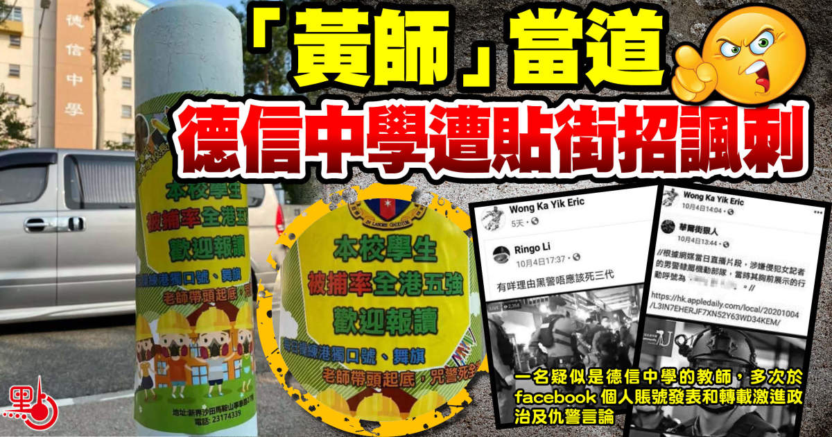 早前被揭發疑以雙重標準、對一名詛咒警員家屬、轉發警員起底資料失德「黃師」從輕發落,僅發警告信了事的德信中學,有網友發現該校正門外的行人路上及附近地鐵站,近日被貼上「招生」單張,除印上疑似德信中學校徽,亦有該校校長羅春平的頭像,內容寫上「本校學生被捕率全港五強歡迎報讀」、「每日操練『港獨』口號、舞旗,老師帶頭起底,咒警死全家」,配上一群戴上「豬嘴」、黃頭盔的青少年。相信是有人以此抗議德信學校縱容政治入校,鼓動莘莘學子參與違法活動,葬送前程。