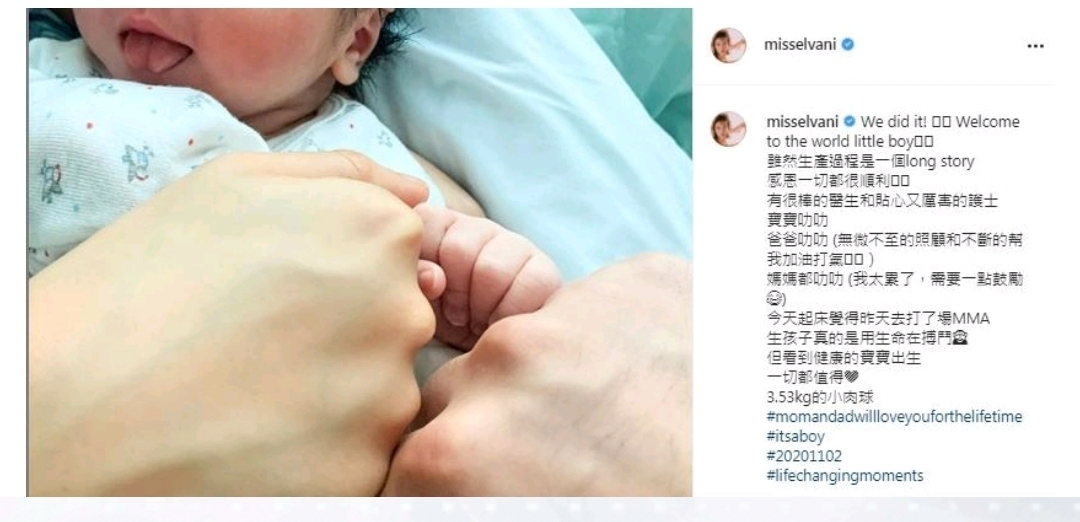 33歲的「IG女神」倪晨曦今日(3日)在IG貼文宣布一索得男,兒子重3.53kg(約7.7磅),母子平安。倪晨曦稱感恩一切順利,多謝老公無微不至的照顧和不斷幫她加油打氣。貼文中表示生完B後覺得累,更形容過程好似打一場MMA(總合格鬥):「今天起床覺得昨天去打了場MMA,生孩子真的是用生命在搏鬥,但看到健康的寶寶出生,一切都值得。」