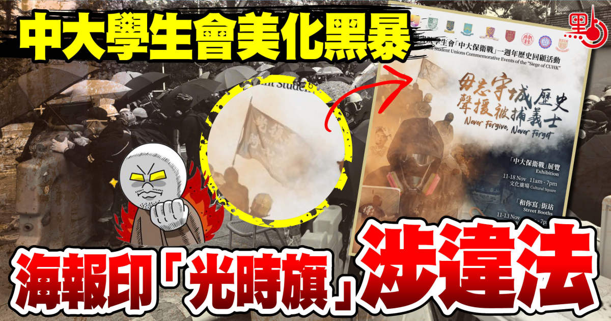 去年黑暴期間,包括一些學生在內的黑衣暴徒佔領香港中文大學,把校園當作「戰場」,學生會更叫囂以「暴大」為榮。事發生近一年,中大學生會幹事會臨時行政委員會及多個書院學生會又再蠢蠢欲動,籌辦所謂「歷史回顧活動」,並在fb上載一幅展覽宣傳海報,刻意將暴徒侵校扭曲成「中大保衛戰」,美化暴徒為「義士」。有關海報更刊有涉嫌違法的「光時」等「港獨」口號,更擅用前任校長沈祖堯及現任校長段崇智的頭像。