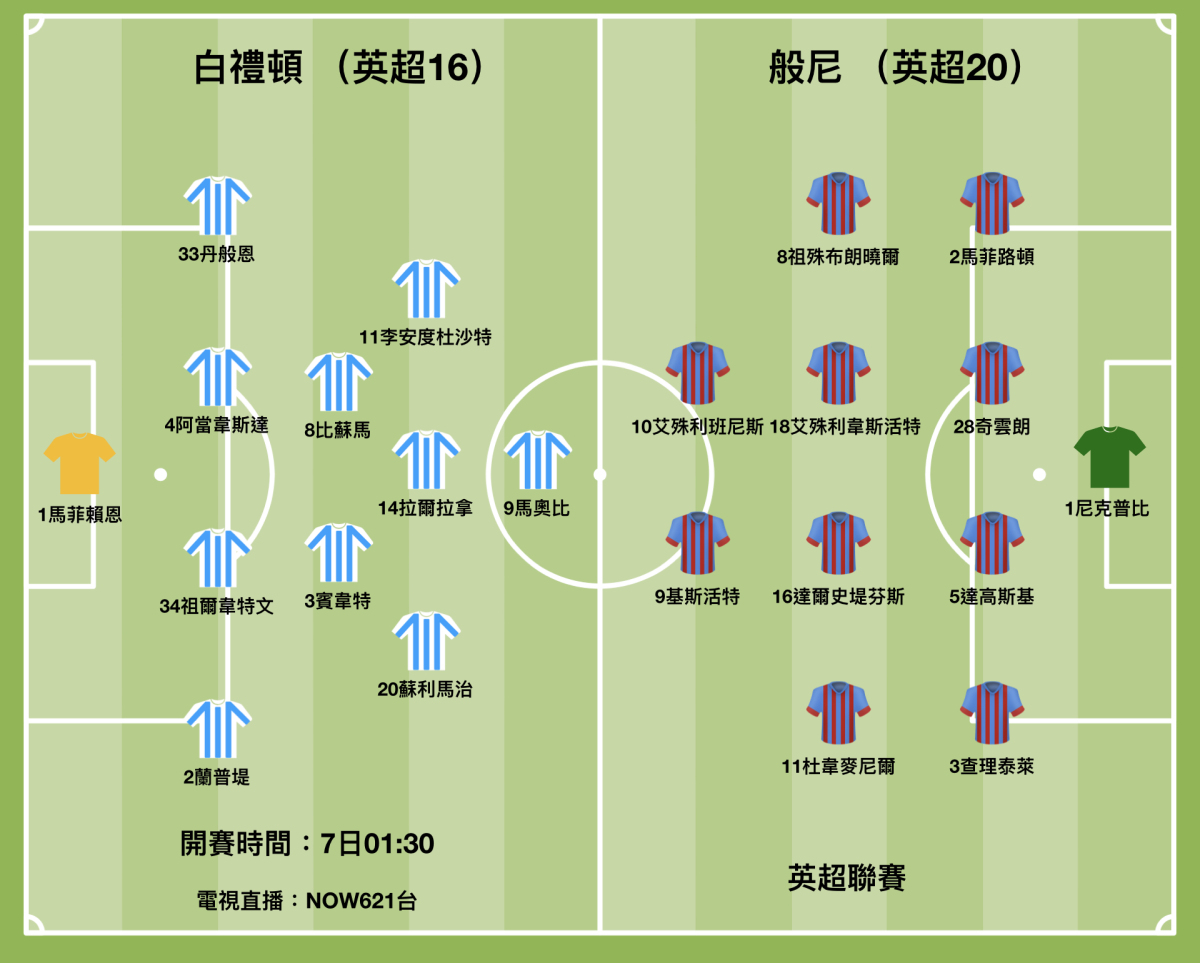 白禮頓雖然表面上錄得近六仗二和四負頹勢,但一眾隊員士氣不差,因為各仗勝負均經歷一番激戰僅敗,主負曼聯2︰3臨完場補時輸12碼,純屬運氣超級不濟,而他們作客面對強勢的愛華頓負2︰4,甚至上仗作客僅負熱刺1︰2,都反映出他們有一定還擊能力,面對榜末的般尼,他們的鋒將馬奧比、翼衛蘭普堤、中場拉拿拉拿等都有望打出全取三分的本領。