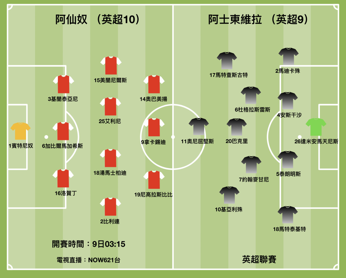 「兵工廠」阿仙奴在周一(9日)凌晨的英超賽事主場迎戰近況回落的阿士東維拉。阿仙奴自從獲幸福女神之助,作客以1︰0力克「紅魔鬼」曼聯後,球隊士氣提升不少,今仗是他們取得所有賽事四連勝的好時機。(香港時間9日凌晨三時十五分開賽,NOW621台直播)