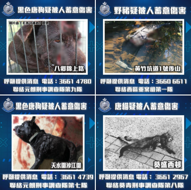 近日,本港先後發生4宗懷疑殘酷對待動物案件,行兇者殘忍手段引發社會關注。警方今(8日)晚在FB專頁表示,正全力調查案件並追緝有關涉案人士。警方呼籲,如市民有任何與案件有關的消息,或目擊案發經過,請立刻聯絡有關調查隊提供相關資料。