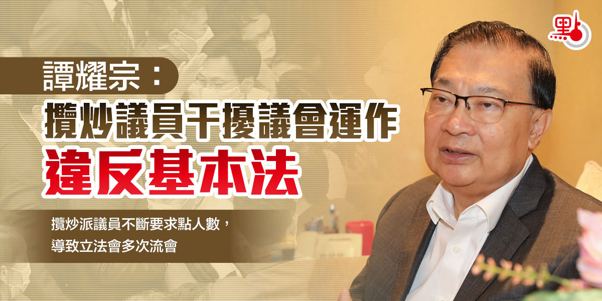 譚耀宗指,作為立法會議員,應按照基本法第104條,宣誓效忠的內容去行事,要擁護基本法,效忠香港特別行政區。但攬炒派議員不斷要求點人數,導致立法會多次流會,荒廢了很多時間,他認為這些行為都是不應該的。譚耀宗又指,媒體民調亦都指出,攬炒派議員的做法顯然不適合作為立法會議員,希望他們正視這些問題。
