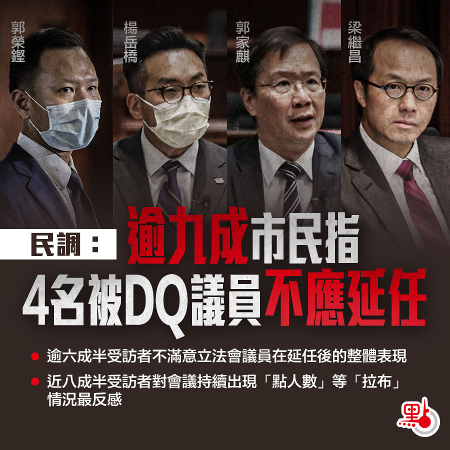 本港第七屆立法會選舉因新冠肺炎疫情嚴峻押後至明年9月舉行,而第六屆立法會議員已延任近一個月。公民社會研究所於11月6日至9日,透過網上問卷進行「立法會議員延任後的表現意見調查」,成功訪問3673名15歲或以上香港市民。結果顯示,逾九成受訪者認為4名被選舉主任DQ的議員(郭榮鏗、楊岳橋、郭家麒、梁繼昌)不應繼續延任。