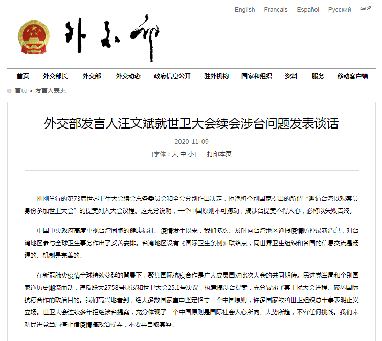 剛剛舉行的第73屆世界衞生大會續會總務委員會和全會分別作出決定,拒絕將個別國家提出的所謂「邀請台灣以觀察員身份參加世衞大會」的提案列入大會議程。外交部發言人汪文斌對此回應稱,這充分說明一個中國原則不可撼動,搞涉台提案不得人心,必將以失敗告終。