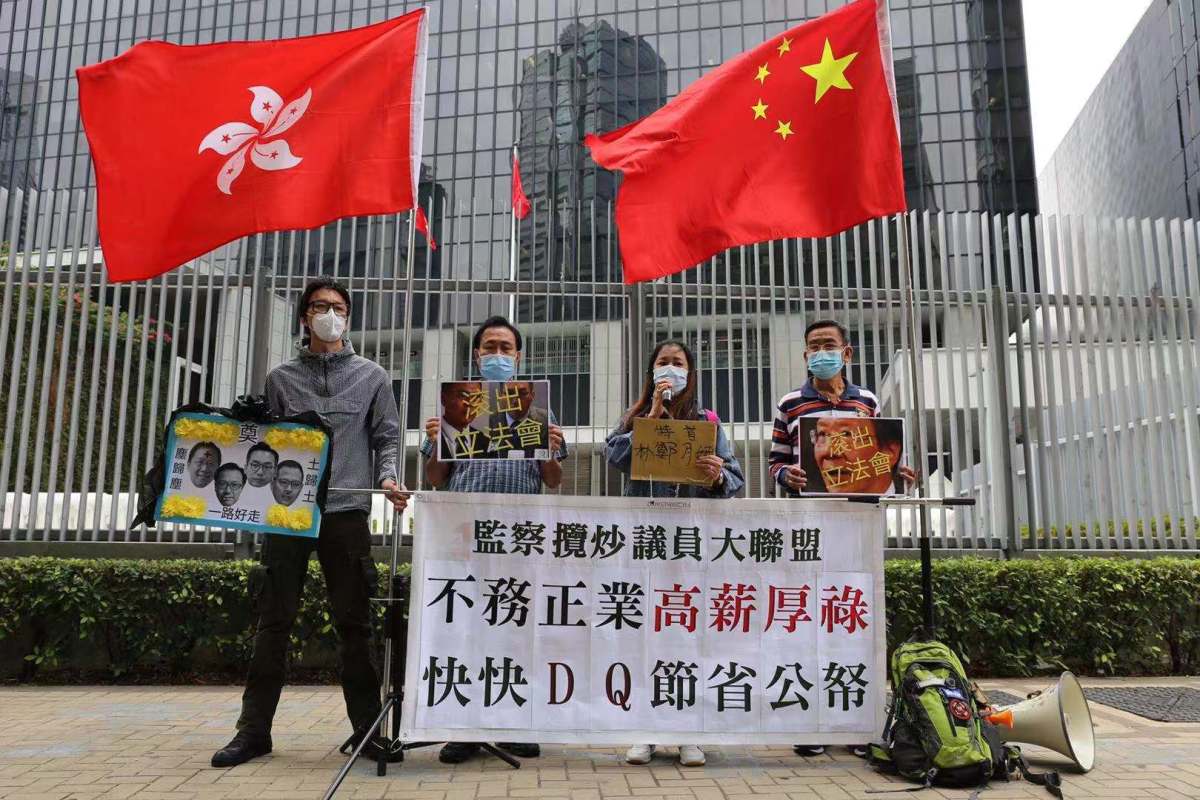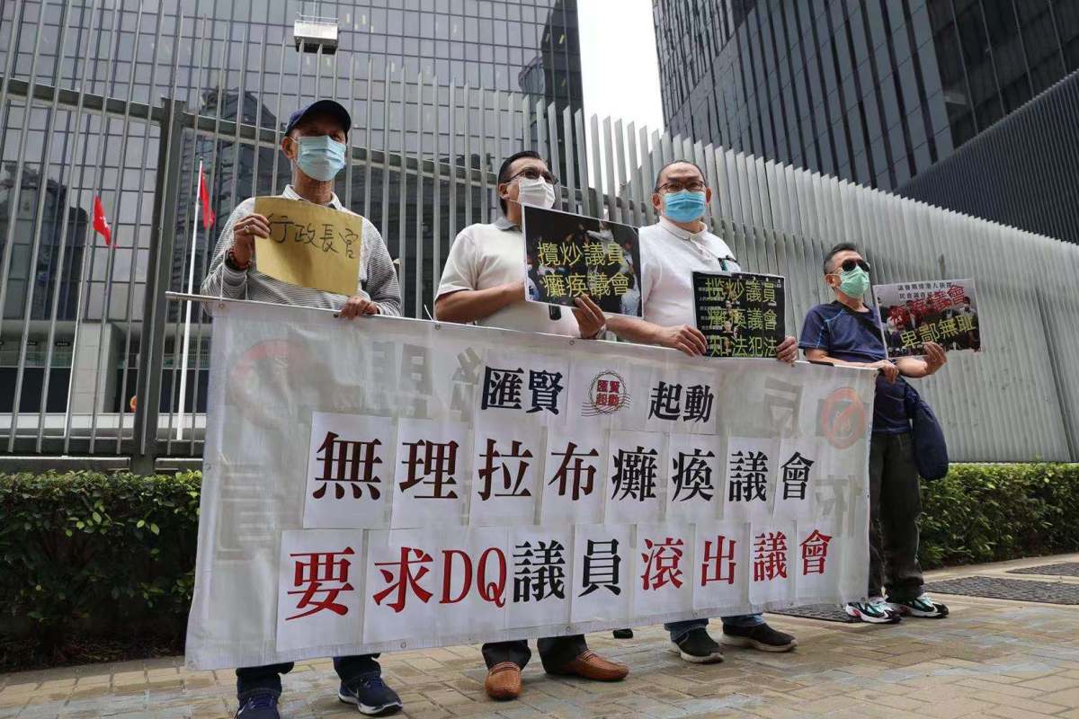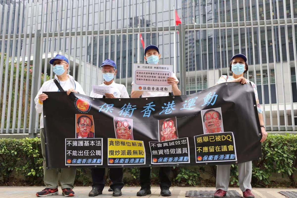 團體「保衛香港運動」成員拉起寫有「被DQ者不應留任」的橫額,上面分別貼有楊岳橋、郭榮鏗、郭家麒、梁繼昌的頭像。團體指出,根據基本法第79條(七),立法會議員行為不檢或違反誓言,經立法會出席會議的議員三分之二通過譴責,立法會主席就可以宣告其喪失立法會議員的資格。因此,團體要求特區政府和立法會主席嚴肅處理阻礙議會運作的議員,維護立法會的尊嚴和形象。