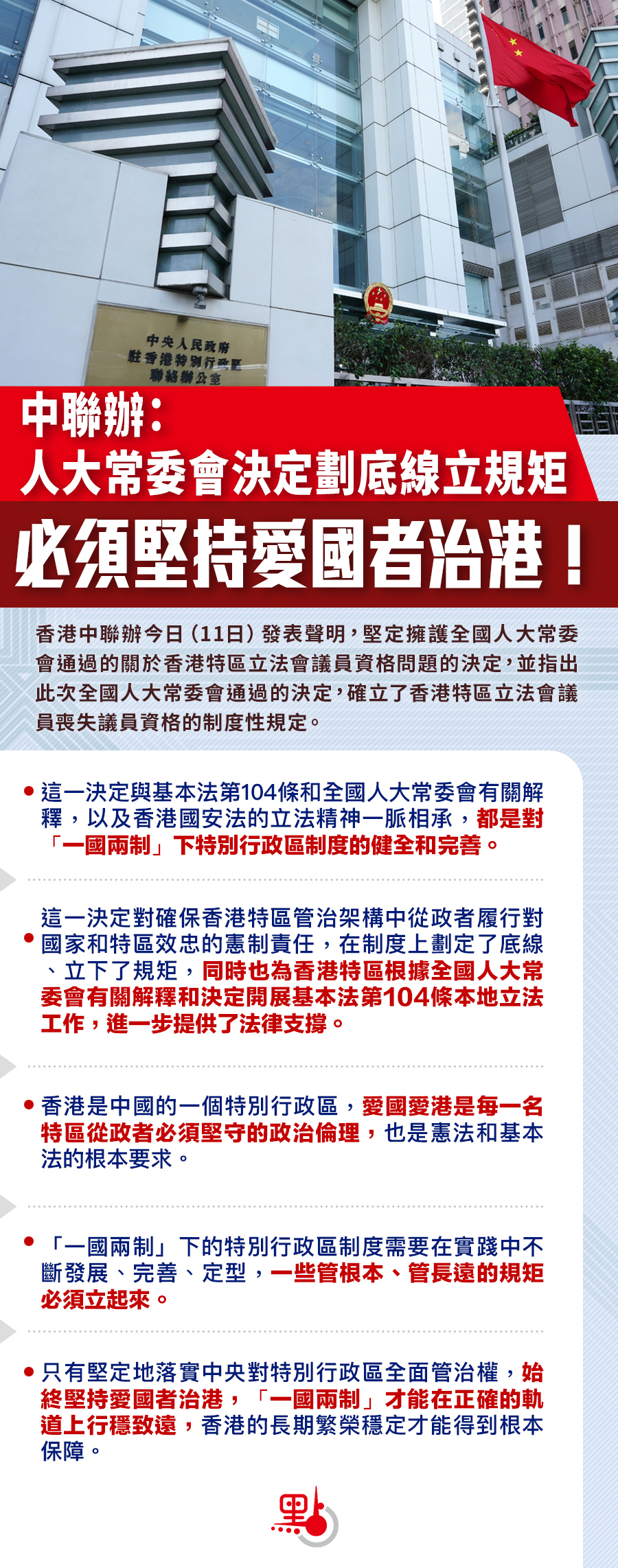 香港中聯辦今日(11日)發表聲明,堅定擁護全國人大常委會通過的關於香港特區立法會議員資格問題的決定,並指出此次全國人大常委會通過的決定,確立了香港特區立法會議員喪失議員資格的制度性規定。這一決定對確保香港特區管治架構中從政者履行對國家和特區效忠的憲制責任,在制度上劃定了底線、立下了規矩,同時也為香港特區根據全國人大常委會有關解釋和決定開展基本法第104條本地立法工作,進一步提供了法律支撐。