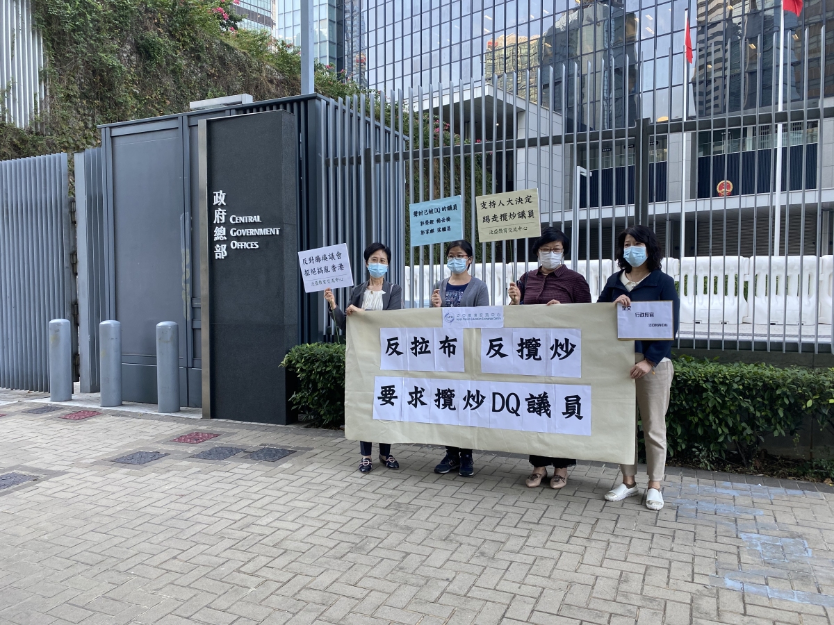 團體「泛亞教育交流中心」4名代表今日下午於政府總部外,拉起寫有「反拉布 反攬炒 要求攬炒DQ議員」的橫額,表示支持全國人大常委會的決定。發言人陳女士在接受點新聞訪問時說,「攬炒派在今屆立法會一開局,就搞到三次流會,存心攬炒香港,完全違背他們就職時的誓言,根本不符合『愛國者治港』的基本要求,所以好感謝人大及時出手,清除立法會毒瘤。」