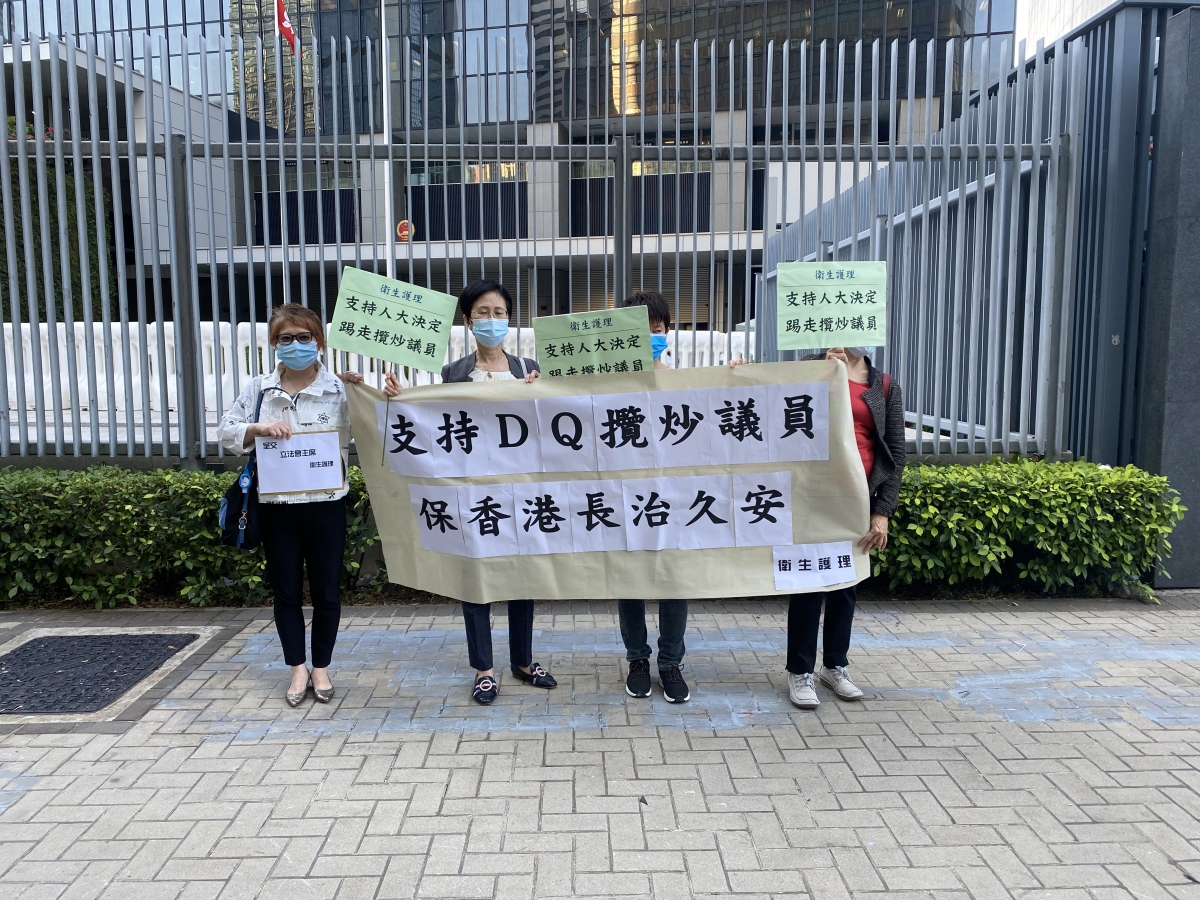 其後,亦有衞生護理界4名代表高舉寫有「支持DQ攬炒議員 保香港長治久安」的橫額,批評楊岳橋、郭榮鏗、郭家麒及梁繼昌4人,在今年立法會選舉中已被選舉主任撤銷參選人的資格後,「但仍厚顏無恥,賴死唔走,繼續在立法會狂拉布玩流會」,嚴重阻礙審議民生法案。