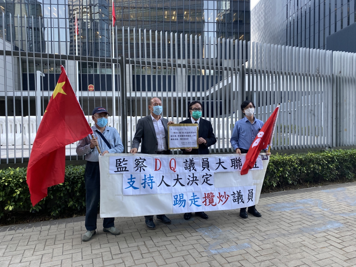 全國人大常委會昨日(11日)通過香港立法會議員資格問題的決定後,特區政府隨即宣布DQ楊岳橋、郭榮鏗、郭家麒及梁繼昌。多個市民團體今日(12日)到政府總部外請願,支持人大「及時出手」踢走攬炒議員。