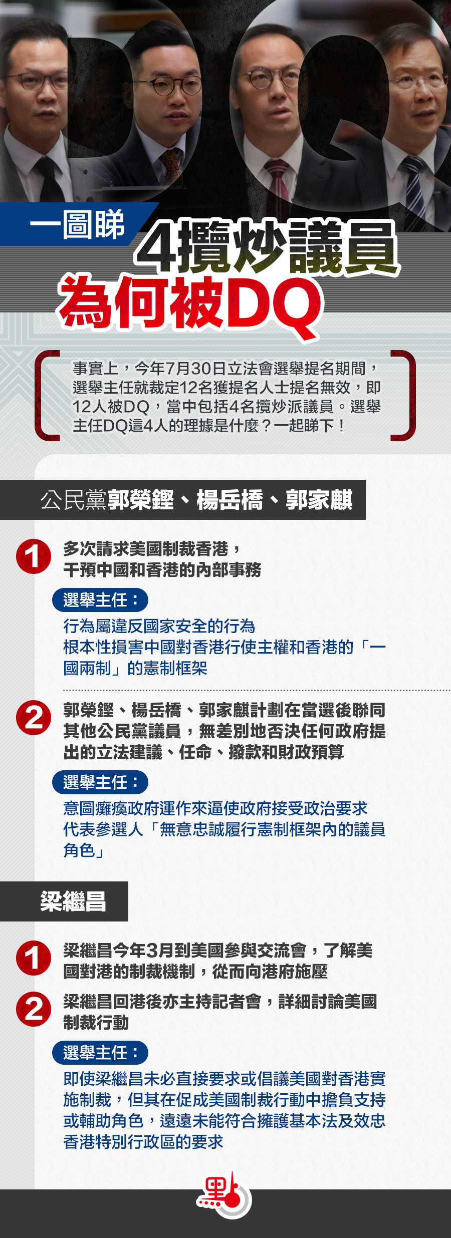 事實上,今年7月30日立法會選舉提名期間,選舉主任就裁定12名獲提名人士提名無效,即12人被DQ,當中包括這4名攬炒派議員。選舉主任當時指出,參照特區原訟法庭就陳浩天案的判詞,擁護《基本法》的意圖,不是僅僅為了遵守《基本法》,而是更需支持、推廣和信奉《基本法》。選舉主任DQ4人的理據是什麼?一起睇下!