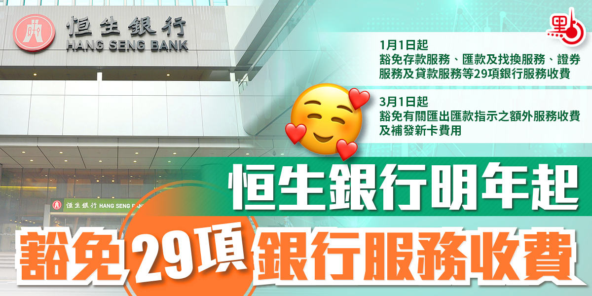 恒生銀行今日(16日)表示,將由明年1月1日起豁免29項銀行服務收費,包括存款服務、於開戶後三個月內結束戶口、匯款及找換服務、證券服務及貸款服務等。另外,有關匯出匯款指示之額外服務收費及補發新卡費用將由明年3月1日起豁免。