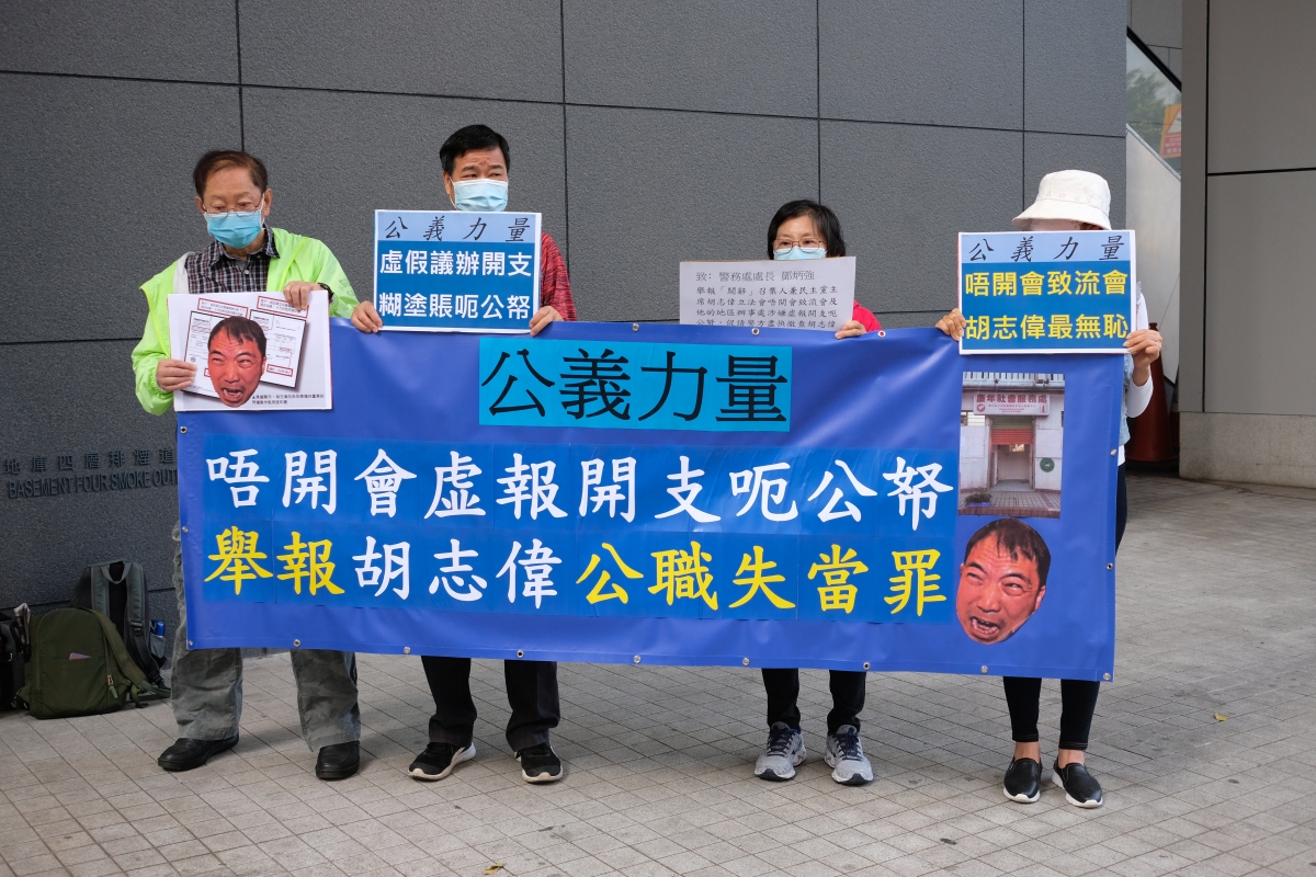 團體「公益力量」一行4人今日下午到警總外集會,並拉起寫有「唔開會虛報開支呃公帑 舉報胡志偉公職失當罪」的橫額;更有人手持「唔開會致流會 胡志偉最無恥」、「虛假議辦開支 糊塗賬呃公帑」等標語。