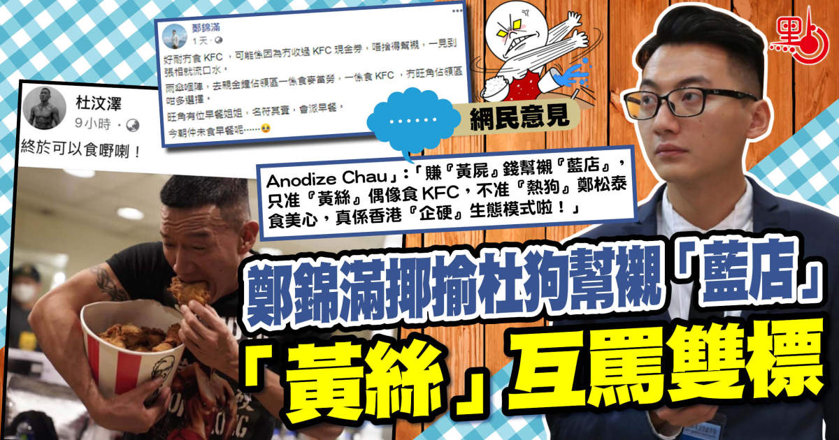 攬炒派成日教「黃絲」乜嘢都要政治化,連食餐飯都要分顏色,搞所謂嘅「黃色經濟圈」。早前「熱血公民」立法會議員鄭松泰(蟲泰)對住美心生日蛋糕影許願相,畀「黃絲」鬧爆佢對唔住「手足」。噚日「熱狗」副主席鄭錦滿,終於忍唔住喺fb發帖反擊成日幫「黃店」賣廣告嘅「黃絲偽人」杜汶澤食KFC炸雞嘅相,留言大鬧:「只許『杜狗』食怡和,不准『熱狗』食美心!」但係點知鄭錦滿護主返被圍插,即畀「黃絲」反問:「佢係藝員,你係政治人物,邊個先應該分清政治立場?」唔少「熱狗」見狀就出嚟護主,鬧返班「黃絲」雙標。「Rick Sanchez」就話:「得啦,總知《蘋果》賣明日大嶼廣告,『黃絲』食『藍店』、淘寶、玩抖音、支持差佬捉市民無戴口罩,都係『黃』到金㗎啦,『熱狗』食美心蛋糕罪大惡極。」「Anodize Chau」則話:「賺『黃屍』錢幫襯『藍店』,只准『黃絲』偶像食KFC,不准『熱狗』鄭松泰食美心,真係香港『企硬』生態模式啦!」