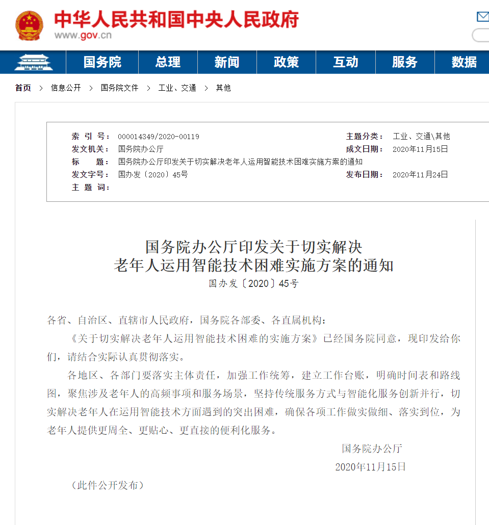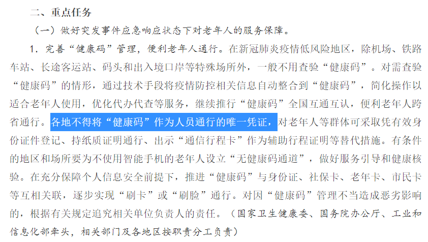 11月24日,國務院辦公廳印發關於切實解決老年人運用智能技術困難實施方案的通知。通知指出,在新冠肺炎疫情低風險地區,除機場、鐵路車站、長途客運站、碼頭和出入境口岸等特殊場所外,一般不用查驗「健康碼」。對需查驗「健康碼」的情形,通過技術手段將疫情防控相關信息自動整合到「健康碼」,簡化操作以適合老年人使用,優化代辦代查等服務,繼續推行「健康碼」全國互通互認,便利老年人進行就醫、消費、跨省通行等活动。