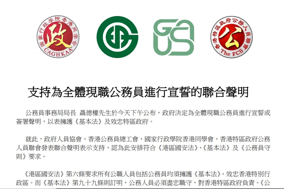 公務員事務局局長聶德權今日(26日)公布,政府決定為全體現職公務員一次過進行宣誓及簽署聲明,以確保擁護基本法及效忠香港特區。政府人員協會、香港公務員總工會、國家行政學院香港同學會、香港特區政府公務人員聯會今晚發表聯合聲明,支持公務員事務局的決定,認為此安排符合基本法、香港國安法及《公務員守則》的要求。