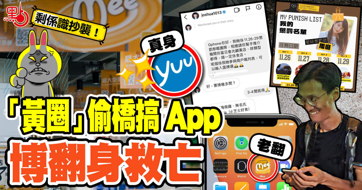 好多「黃店」生意就一落千丈,攬炒派近期就搞咗所謂「懲罰祭」想救亡,仲計劃推出一個屬於「黃圈」嘅流動應用程式「Mee」,話要推動懲罰黃店嘅力量,但個設計就擺明偷橋抄足牛奶公司的獎賞計劃「Yuu」,仲居然大條道理話雙方理念一樣,提供日常生活所需,包括由起居飲食,甚至係生離死別嘅服務云云。佢哋仲好意思大鑼大鼓話喺全港各區挑選左六間喺運動期間默默耕耘同付出嘅黃店,以模仿「Yuu」的風格進行「裝修」㖭!