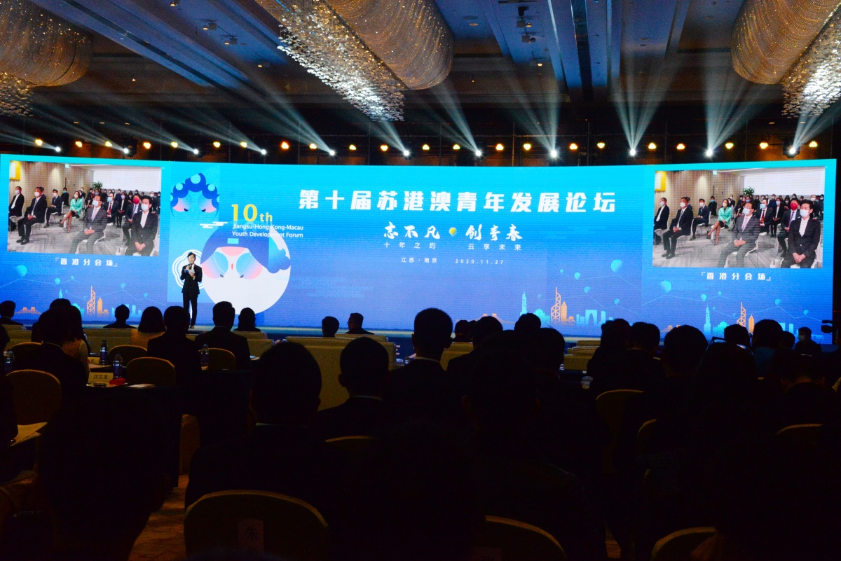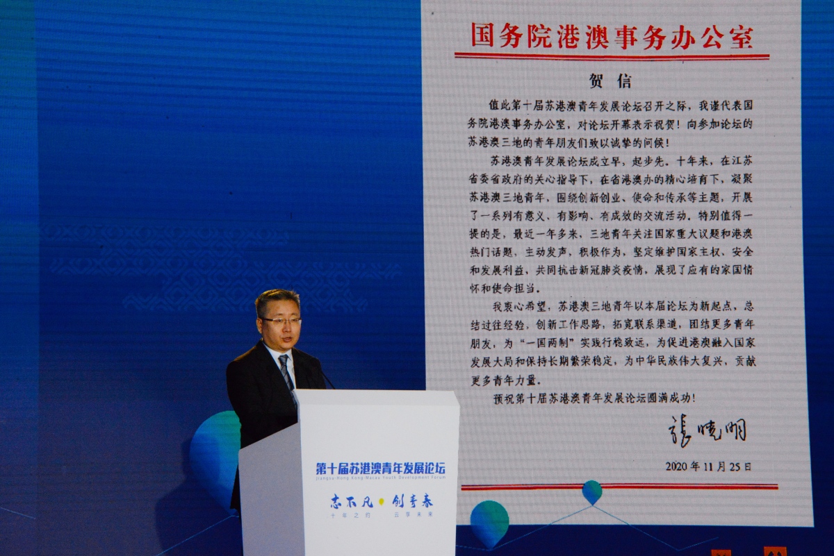 第十屆蘇港澳青年發展論壇今日(27日)在南京和香港連線舉行,來自江蘇、香港、澳門三地的300多位青年代表分別在南京主會場和香港分會場參會。國務院港澳辦常務副主任張曉明為論壇發來賀信,希望蘇港澳三地青年為「一國兩制」實踐行穩致遠,為港澳融入國家發展大局和保持長期繁榮穩定,為中華民族偉大復興,貢獻更多青年力量。