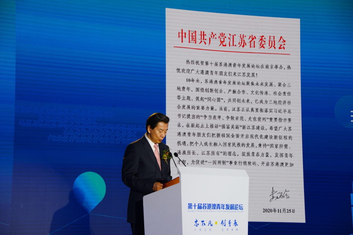 張曉明在賀信中表示,蘇港澳青年發展論壇成立早,起步先。十年來,在江蘇省委省政府的關心指導下,在省港澳辦的精心培育下,凝聚蘇港澳三地青年,圍繞創新創業、使命和傳承等主題,開展了一系列有意義、有影響、有成效的交流活動。最近一年多來,三地青年關注國家重大議題和港澳熱門話題,主動發聲,積極作為,堅定維護國家主權、安全和發展利益,共同抗擊新冠肺炎疫情,展現了應有的家國情懷和使命擔當。