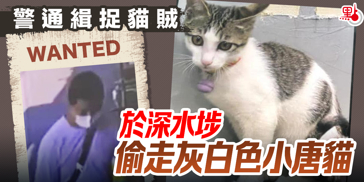 警方今日(28日)於社交網站發文指,現正通緝一名年約40-50歲,約1.7米高、肥材、蓄短髮男子。他涉嫌於昨日上午9時50分在荔枝角道224號一店鋪外,偷去一隻3個月大灰白色唐貓,貓頸上有一條紅繩及掛有紫色叮噹,並往石硤尾街逃去。涉案男子犯案時身穿白色上衣、黑色長褲、波鞋,攜有一個斜揹袋、一個紅色膠袋及一個白色膠袋。