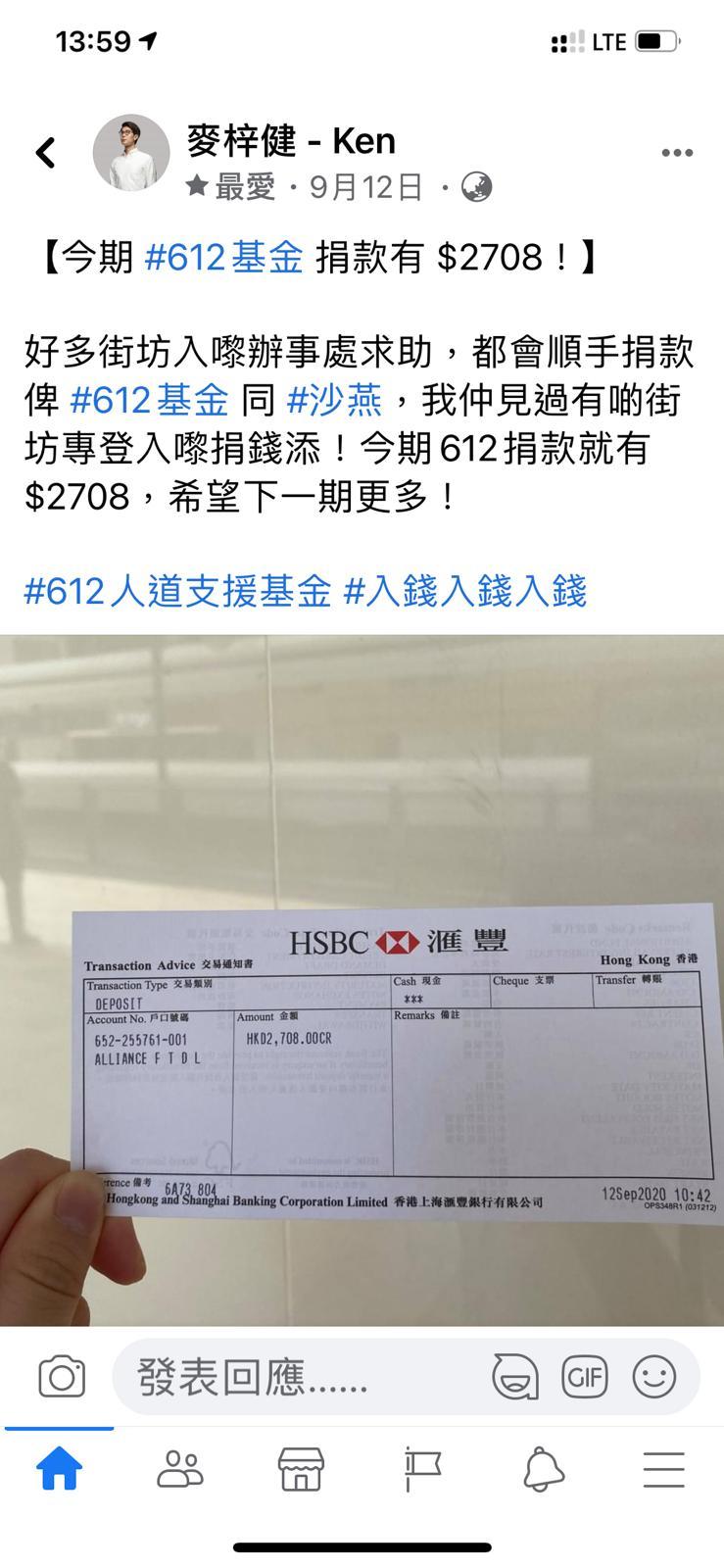 「事實上,公眾一直對612基金的資金來源及賬目明細存疑,基金亦有資助去年至今涉參與黑暴的被補人士。麥作為中華人民共和國香港特別行政區的區議員,不少居民都不齒麥議員利用其議員辦事處捐款予該基金,亦對其收取的捐款明細及去向感到疑慮」,陳壇丹表示,辦事處租金支出均為公帑支付,不少居民質疑麥梓健是否在利用公帑資源變相為黑暴籌款,麥梓健必須向公眾交代透過辦事處收到的捐款金額及去向,以及到底有沒有合法的籌款牌照。陳壇丹還要求政府部門調查事件,避免公帑被應用在與區議會議員職能以外的用途。
