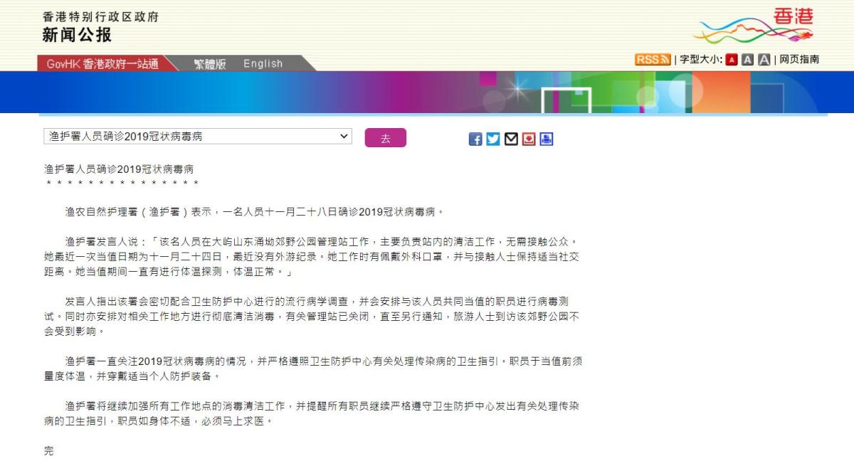 漁農自然護理署(漁護署)表示,一名人員11月28日確診新冠肺炎。