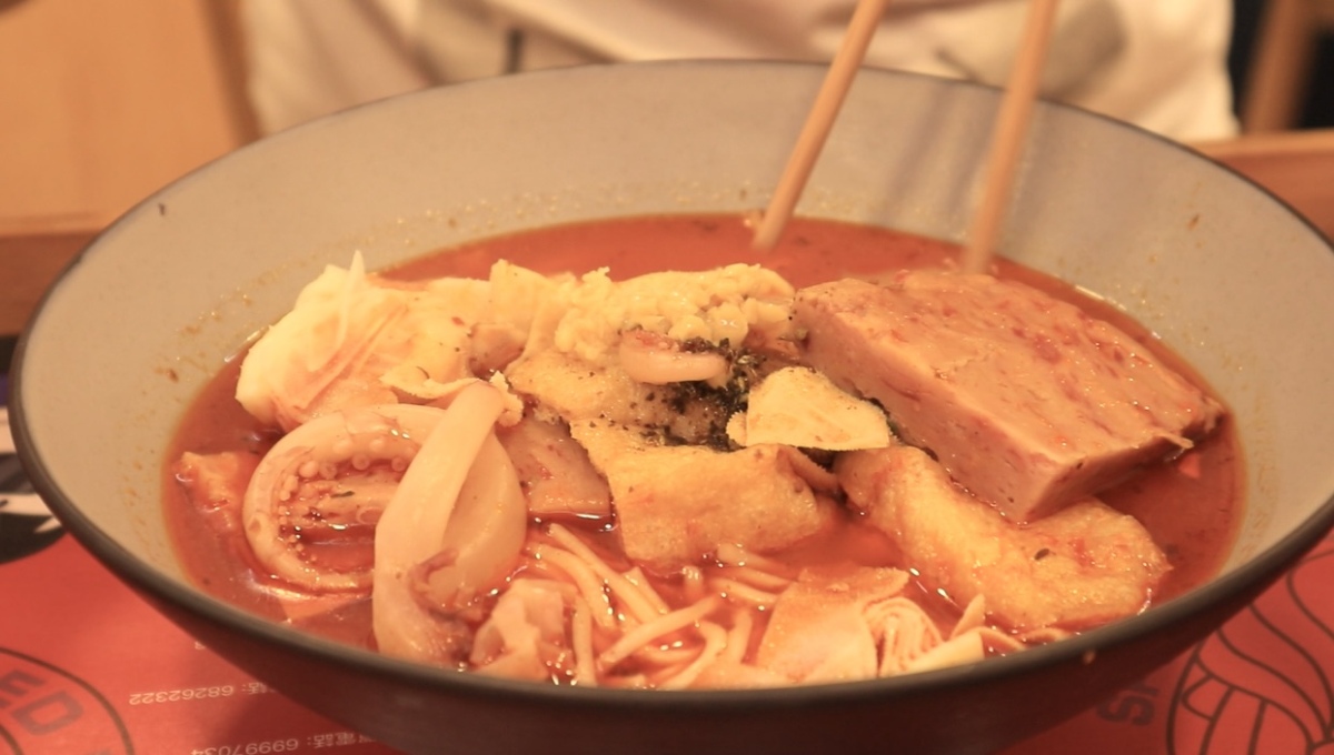 坐下來掃二維碼就可以點單,菜單真的很豐富,基本上涵蓋了小編腦海中能想到的所有麻辣燙食材:肥牛、羊肉、蟹籽丸、炸響鈴、牛柏葉、魷魚、午餐肉⋯⋯甚至還有小編在香港第一次看到的牛骨髓!上菜速度也是一流,五分鐘左右,最先下單的「大碗麻辣燙」就做好了,登登登,就是長這個樣子喇!
