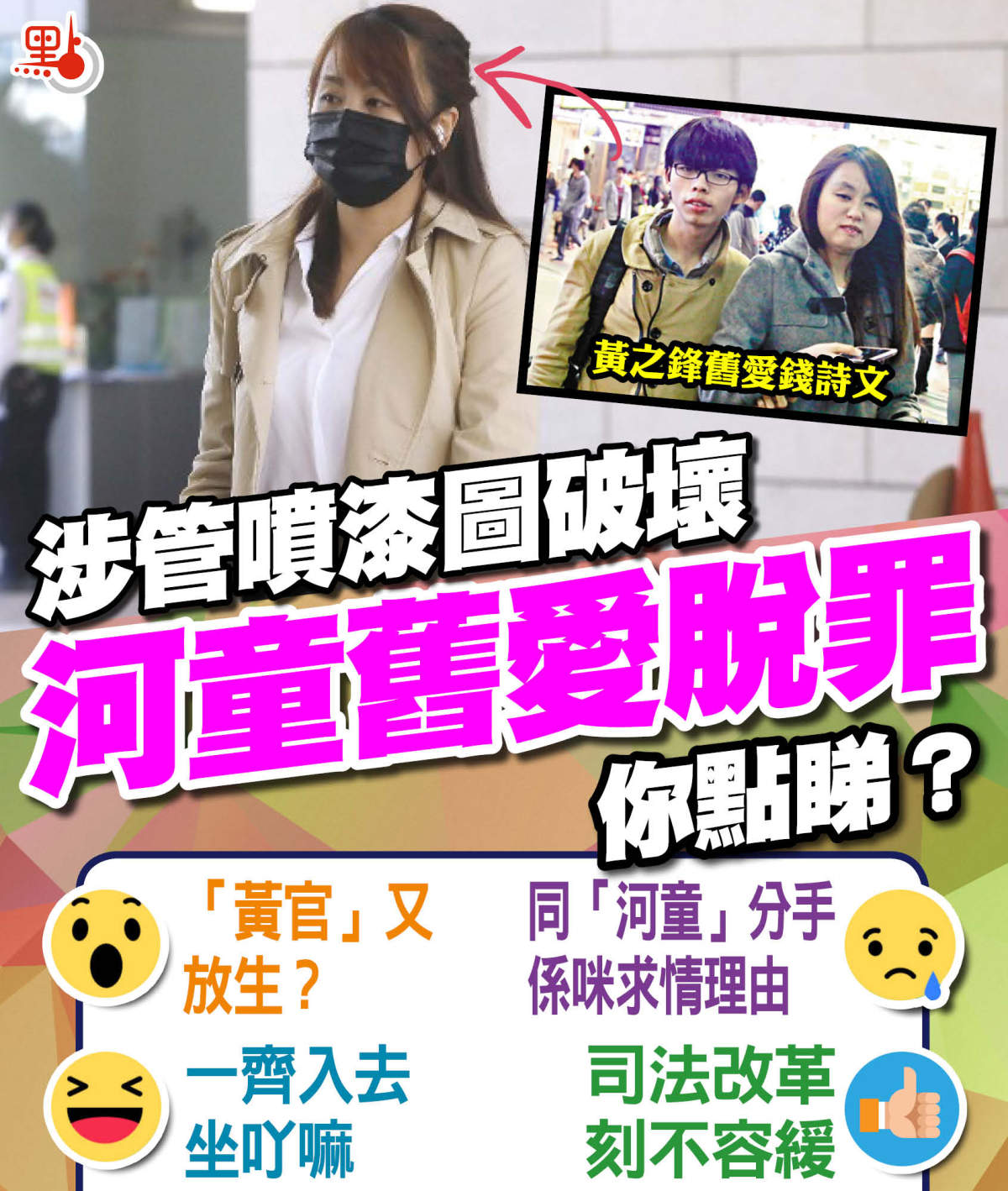 前「香港眾志」秘書長黃之鋒(河童)噚日被判監13個半月,咁啱得咁橋,佢的前女友、前「學民思潮」成員錢詩文亦因今年1月19日在旺角身攜一噴漆,被控一項管有物品意圖損壞財產罪,案件同日在西九龍法院開審,她更「執番身彩」獲裁定罪名不成立,並獲批訟費。裁判官林子勤裁決時指,本案的證供未足以證明被告有損毀他人財物的意圖。