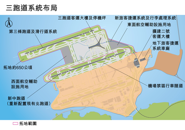 行政長官林鄭月娥在今年的《施政報告》中指出,機場管理局將按照原定目標,分別於2022年及2024年啟用第三條跑道及整個三跑道系統,並預計於2023年完成「高端物流中心」及於2021至2027年分階段完成「航天城」發展項目。機管局行政總裁林天福今日(3日)表示,機場第三條跑道系統本月底將大致完成填海工程,今年10月已開始鋪設跑道,預料明年年底完成,有信心可如期並在預算的1415億元內完成工程。