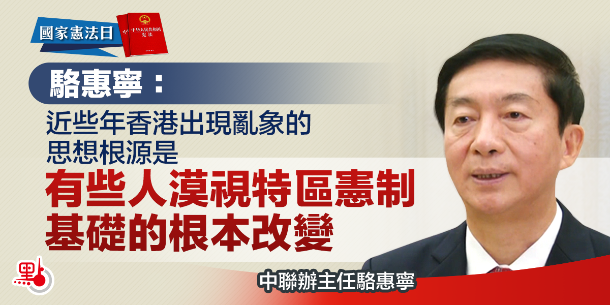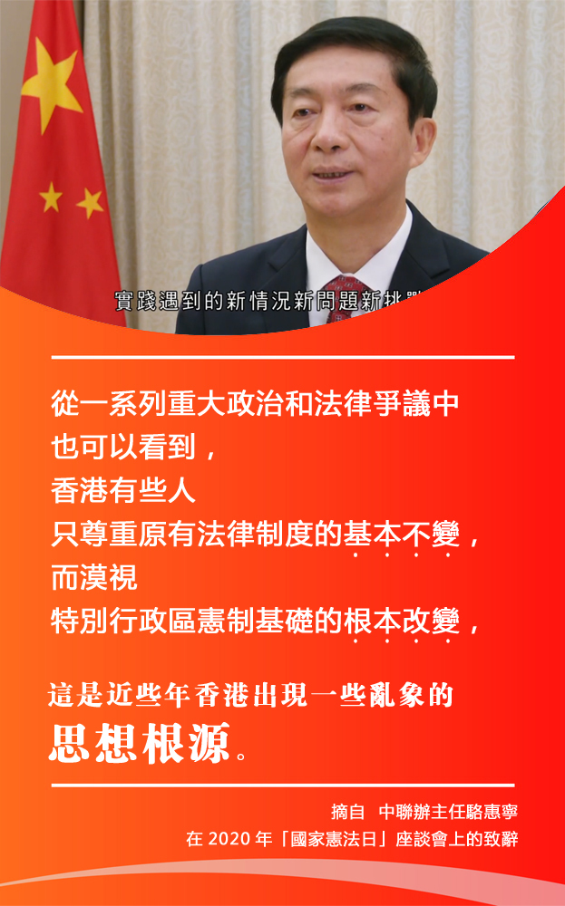 今日(4日)是「國家憲法日」,香港特區政府舉辦以「憲法與國家安全」為主題的網上座談會。香港中聯辦主任駱惠寧在致辭時表示,回歸23年來,從整體上看,憲法和基本法得到有效實施,「一國兩制」實踐取得巨大成功。但毋庸諱言,從一系列重大政治和法律爭議中也可以看到,香港有些人只尊重原有法律制度的基本不變,而漠視特別行政區憲制基礎的根本改變,這是近些年香港出現一些亂象的思想根源。